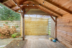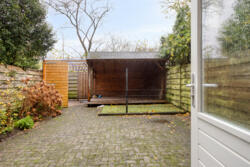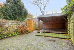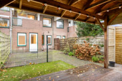 De verzorgde achtertuin (ca. 50 m²) met overkapping en toegang naar de weg.