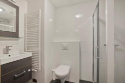De badkamer (ca. 4,5 m²) is geheel betegeld in wit en beschikt over een douche, toilet en wastafel.