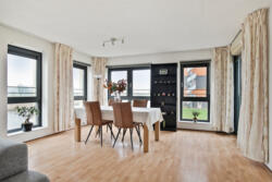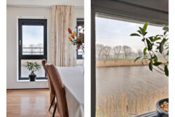 De woonkamer is een heerlijke, lichte leefruimte met grote raampartijen die zorgen voor een prachtige lichtinval en een panoramisch uitzicht over het water en de groene omgeving. Dankzij de royale afmetingen is er meer dan voldoende ruimte voor een comfortabele zithoek en een ruime eettafel.