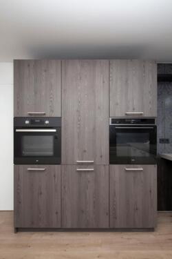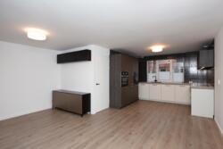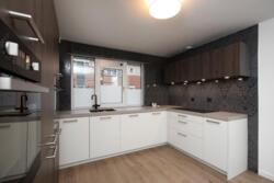 De luxe keuken met verzorgd werkblad bevindt zich aan de voorzijde van de woning. De keuken is uitgerust met diverse inbouwapparatuur, waaronder een koelkast, vriezer, vaatwasser, combi-oven, keramische kookplaat en beschikt over voldoende opberg- en kastruimte. De woonkamer en keuken zijn voorzien van een nette laminaatvloer.