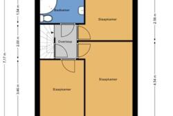 Landing with three spacious bedrooms. At the front of the house there is one bedroom which is equipped with shutters. The other two bedrooms are located at the rear. The bathroom has a washbasin, second toilet and a bath. The entire floor has a new laminate floor.