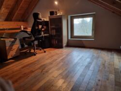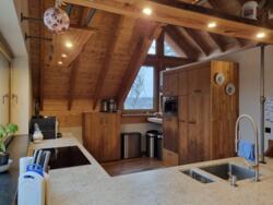 Wanneer u binnenkomt, wordt u direct omarmd door de warme sfeer van natuurlijke materialen. De woon-eetkamer met open haard vormt het hart van het huis. Hier geniet u op winteravonden van knusse momenten met familie of vrienden, terwijl het haardvuur zachtjes knettert op de achtergrond. De massieve eikenhouten vloer met vloerverwarming loopt door in de woonkamer, master bedroom en keuken en zorgt voor een gevoel van luxe en comfort.