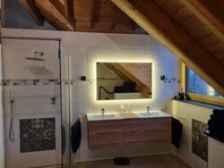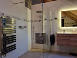- Moderne slaapkamer met on suite badkamer met inloopdouche en dubbele wastafel en toilet.