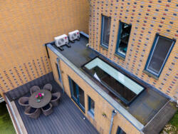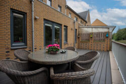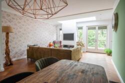 De uitgebouwde woonkamer bevindt zich aan de achterzijde van de woning, met veel licht (lichtkoepel) en toegang tot het brede terras.