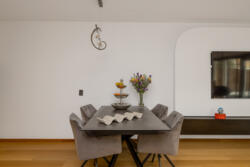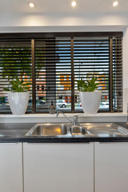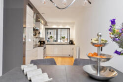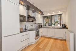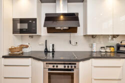 Aan de voorzijde van de woning bevindt zich de moderne, open keuken, uitgerust met voldoende opbergruimte, een granieten aanrechtblad en de volgende inbouwapparatuur: 4 pits inductie kookplaat, afzuigkap, oven, vaatwasser en een koel-vriescombinatie.