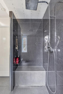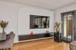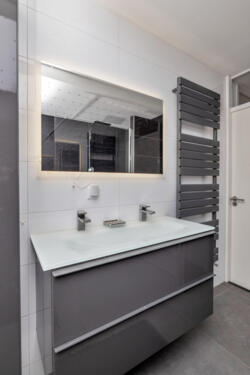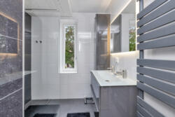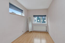 De overloop biedt toegang tot drie ruime slaapkamers: slaapkamer 1 aan de voorzijde van de woning en slaapkamer 2 aan de achterzijde. Slaapkamer 3 eveneens aan de achterzijde is voorzien van praktische inbouwkasten. De moderne badkamer is uitgerust met een inloopdouche en een stijlvol wastafelmeubel. Daarnaast bevindt zich op deze verdieping een separaat toilet met fonteintje.