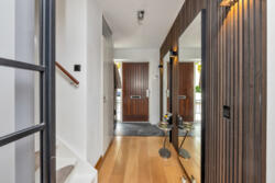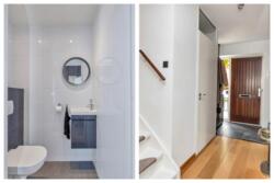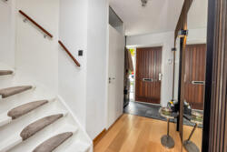 De hal beschikt over de meterkast, een garderobe en een toiletruimte met wandcloset en fonteintje.