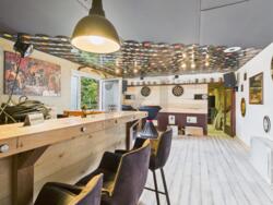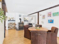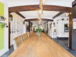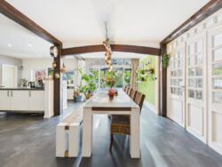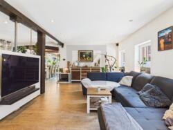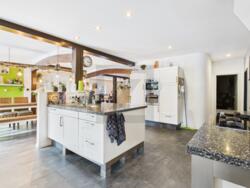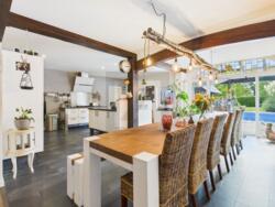 • Lichtdoorlatende woon- en eetkamer in het hoofdgebouw met open haard en toegang tot overdekt terras; aangrenzende open keuken met kookeiland en hoogwaardige inbouwapparatuur.