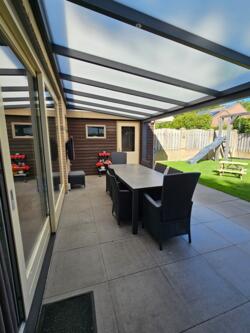 Buiten wacht je een onderhoudsvriendelijke zonnige tuin met een houten berging en een heerlijke overkapping.