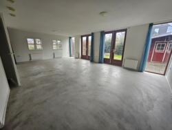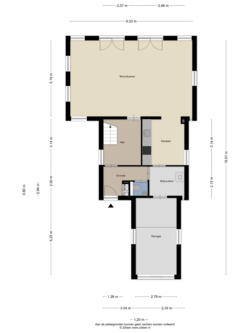 entree, ruime hal met zijraam, meterkast, toiletruimte v.v. wandcloset en fonteintje, royale lichte woonkamer met openslaande deuren die toegang bieden tot de zonnige tuin rondom het huis. De garage aan de voorkant van de woning is gedeeltelijk afgewerkt en kan betrokken worden bij de woning, dus eventueel te gebruiken als eetkamer. Tussen de keuken en garage is er een bijkeuken.