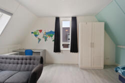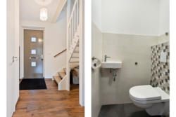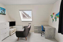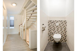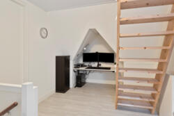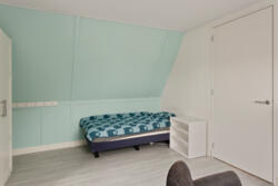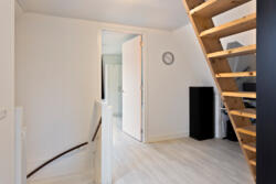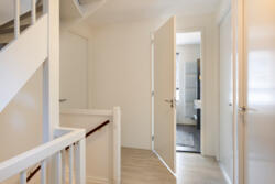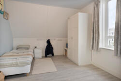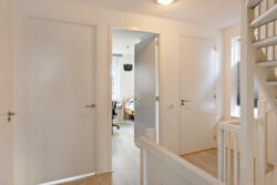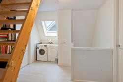 Op de eerste verdieping ligt de master bedroom met een ruime inloopkast en veel daglicht. Twee andere slaapkamers bevinden zich aan de achterzijde, met de badkamer en een aparte toiletruimte centraal gelegen. De badkamer is voorzien van een ligbad, douche en stijlvol tegelwerk. Op de tweede verdieping zijn nog twee slaapkamers en een multifunctionele ruimte voor was, werkplek of extra bergruimte. De praktische zolder, bereikbaar via een vaste trap, biedt nog eens 10 meter aan extra opslag.