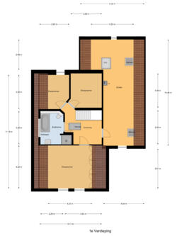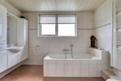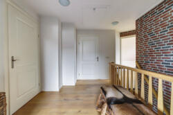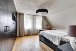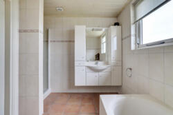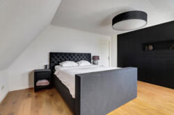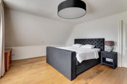 Royale overloop, 2 slaapkamers aan de achterzijde, royale ouderslaapkamer aan de voorzijde met luxe inbouwkast, royale badkamer voorzien van ligbad, douche, vaste wastafel, wandcloset, extra deur naar de fitnessruimte c.q. stookvertrek boven de garage, mogelijkheid voor extra slaapkamer gecombineerd met hobbyruimte en eventueel extra bergruimte, toegankelijk te maken vanuit de garage.