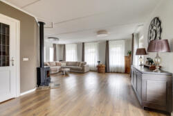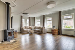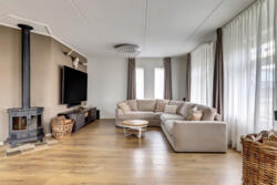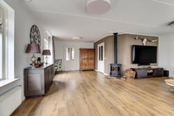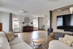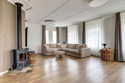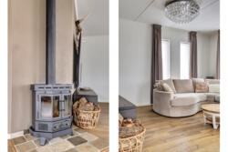 Woonkamer voorzien van een sfeervolle houtkachel.