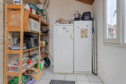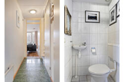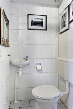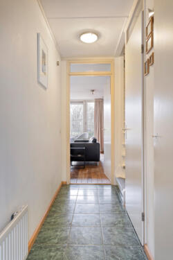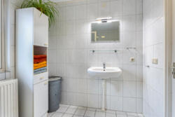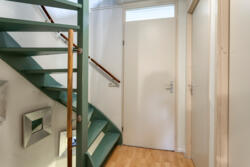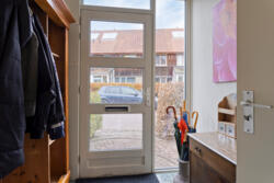 Binnenkomst gebeurt via de vestibule die overgaat in een nette hal met trapopgang, toilet met fonteintje en een praktische voorraadkast. De plavuizen vloer geeft direct een verzorgde indruk. Vanuit de keuken is de aangebouwde bijkeuken en schuur bereikbaar, ideaal voor extra bergruimte en dagelijkse praktische zaken.