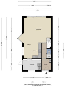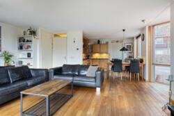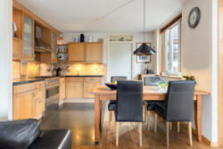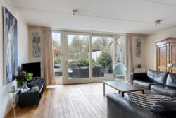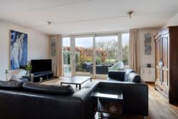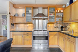 De woonkamer is een heerlijke plek om te vertoeven. Deze is ruim van opzet, zonnig gelegen op het zuidwesten en voorzien van grote raampartijen waaronder een glazen erker en een brede schuifpui. Hierdoor valt het daglicht rijkelijk binnen en heb je continu zicht op de groene omgeving. De beukenhouten vloer geeft de ruimte warmte en karakter. Onder de trap bevindt zich een ruime berging, perfect voor speelgoed of extra opslag. De open keuken is uitgerust met een 6 pits gasfornuis met afzuigkap, oven, koelkast en vaatwasser. De vloer en het aanrechtblad van zwart graniet met vloerverwarming geven een luxe en tijdloze uitstraling.