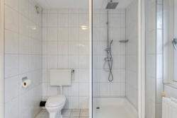 Op de eerste verdieping bevinden zich drie ruime slaapkamers. De hoofdslaapkamer beschikt over een extra glazen erker die zorgt voor prachtig licht en een gevoel van ruimte. De badkamer is praktisch ingericht met een douche, toilet en wastafel, en ook hier is vloerverwarming aanwezig voor extra comfort.