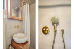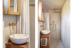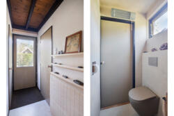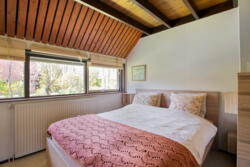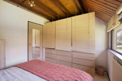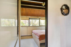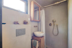 De hoofdslaapkamer (begane grond) is efficiënt ingericht met een tweepersoonsbed voorzien van twee bedladen en een op maat gemaakte hang-legkledingwand; deze inrichting blijft achter. De slaapkamer ligt op een koele plaats aan de noordzijde van het huis en grenst aan de gang naar een compacte badkamer met toilet, wastafelmeubel (teakhout + marmer waskom) en regendouche (Grohe kranen) en afgewerkt met beton cire.