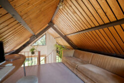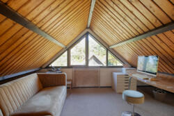 Vanuit de leefruimte bereik je via een open wenteltrap de tussenverdieping, waar thans een werkplek annex TV-zithoek zijn ingericht. Deze tussenverdieping is voorzien van neutrale nieuwe vloerbedekking en eventueel ook prima geschikt om twee of drie slaapplaatsen voor kinderen of logees te realiseren.