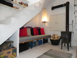 Overall, it offers you four sleeping spaces: in addition to the double bed in the bedroom downstairs, the sofa underneath the stairs can be extended to a full size 2x80x200 bed. The sofa in the living room upstairs is also extendable and suitable for overnight guests, providing an extra fifth sleeping spot. Storage spaces are provided underneath. As well as the wood burner stove, there is also a remote-controlled AC-unit over the balcony door with dual heating and cooling. The beams on the roof have also been insulated from the inside.