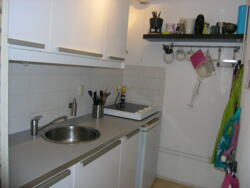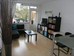 De witte aanbouwkeuken is voorzien van koelkast en kookplaat. Naast de keuken bevindt zich de bergruimte met aansluiting voor de wasmachine. De woonkamer is voorzien van een grote raampartij en is ca. 18 m2. Hier bevindt zich de toegang tot het balkon.