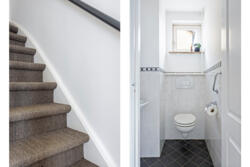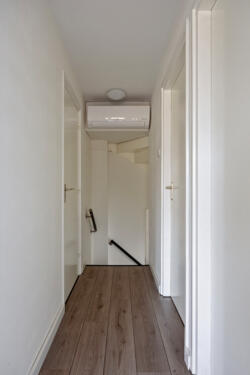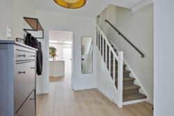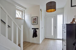Entree/hal met meterkast, trapopgang en toegang tot het toilet. Vanuit de hal bereik je de moderne keuken, voorzien van A-merk inbouwapparatuur oven, inductiekookplaat, vaatwasser en koelkast.
