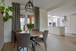 De open verbinding van de keuken met de woonkamer creëert een ruimtelijk gevoel. De raampartijen aan de voor- en achterzijde van de woning zorgen voor een natuurlijk lichtinval in de woon- en zithoek gedurende de hele dag. Dankzij de vloerverwarming en de goede isolatie is het hier ook in de donkere dagen comfortabel leven.