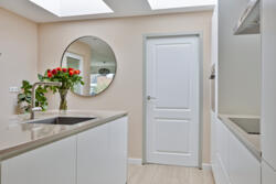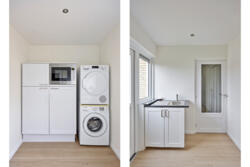 Vanuit de keuken heb je toegang tot de kelder én tot de praktische bijkeuken. De bijkeuken beschikt over witgoedaansluitingen en biedt directe inpandige toegang tot de garage.