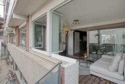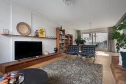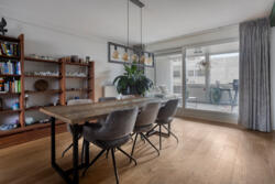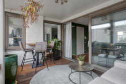 Zodra je binnenstapt, valt de hoogwaardige afwerking direct op. De tijdloze eikenhouten parketvloer loopt door het hele appartement en zorgt voor een warme en moderne uitstraling. De royale woonkamer vormt het hart van de woning. Grote raampartijen laten veel daglicht binnen en geven de ruimte een open, lichte sfeer. Vanuit de woonkamer heb je toegang tot de ruime inpandige loggia – een heerlijke plek om te ontspannen. Dankzij het vouwsysteem van veiligheidsglas kun je hier ook in de winter comfortabel zitten.
