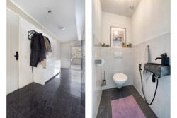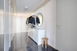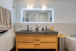 De moderne keuken is een echte blikvanger. Met een granieten aanrechtblad en luxe inbouwapparatuur zoals een koelkast, gaskookplaat, vaatwasser en combi-oven is koken hier een feestje. De badkamer straalt dezelfde luxe uit: een dubbele betonnen wastafel met eikenhouten lades en een grote verlichte spiegel geven een stijlvolle, rustige uitstraling.