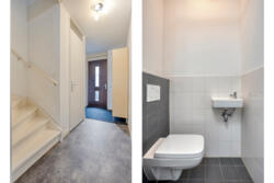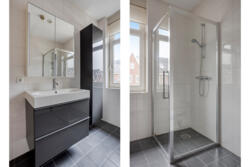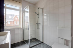 Op de eerste verdieping geeft de overloop toegang tot drie slaapkamers en een nette badkamer, voorzien van een douche, wastafelmeubel en toilet. Ook deze verdieping is uitgerust met vloerverwarming, wat zorgt voor extra wooncomfort.