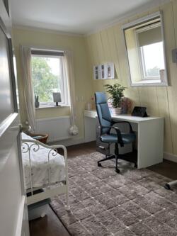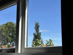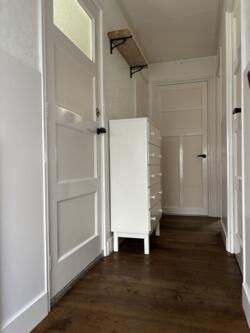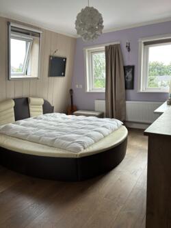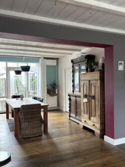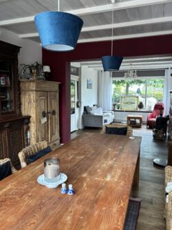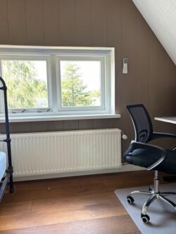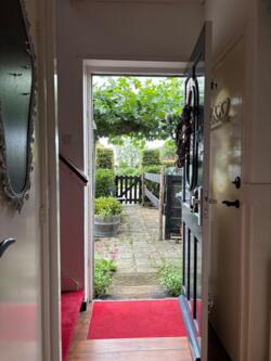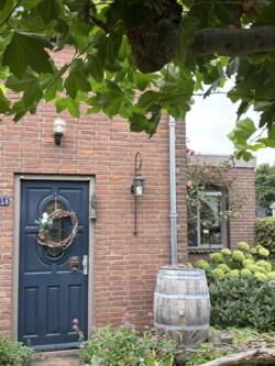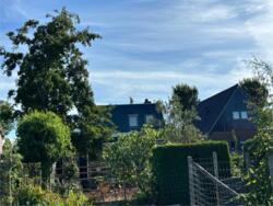 Vanuit twee slaapkamers, de eetkamer, de studio, badkamer, wasruimte en appartement is mooi uitzicht op de gehele groendiverse besloten achtertuin, waar bewegingsvrijheid is voor kinderen en of kleine dieren.