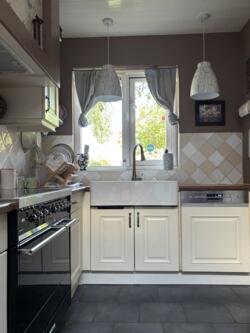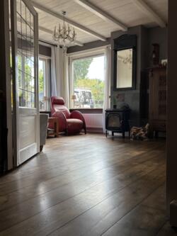 Hier siert ook de functionele en sfeervolle houtkachel, die i.p.v. de c.v.-radiatoren de woning kan verwarmen.
