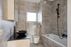 Op de eerste verdieping bevinden zich drie ruime slaapkamers, waarvan de hoofdslaapkamer beschikt over twee openslaande deuren naar het balkon met adembenemend uitzicht over het water. Daarnaast is hier de recent gerenoveerde badkamer, uitgevoerd met een luxe bad-/douchecombinatie, natuurstenen wastafel en toilet.