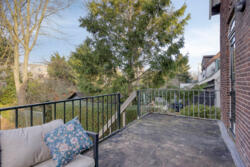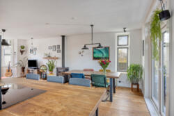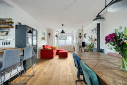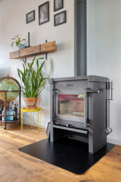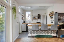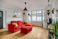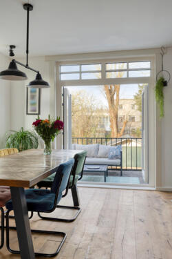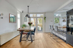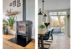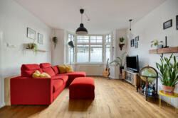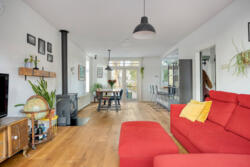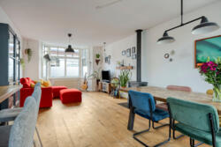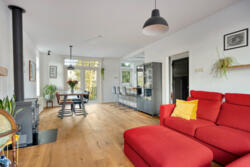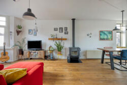 De woonkamer heeft een warme, huiselijke uitstraling dankzij de massieve eikenhouten vloer en de houtkachel met nieuw rookkanaal. De ruimte ontvangt prettig daglicht en voelt vooral intiem en sfeervol. Aan de achterzijde geven openslaande deuren toegang tot het balkon van circa 14 m², met vrij uitzicht over de diepe tuin.