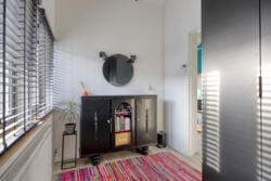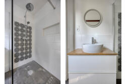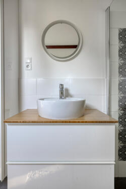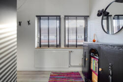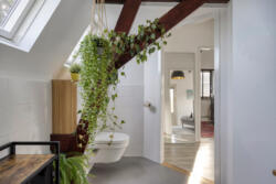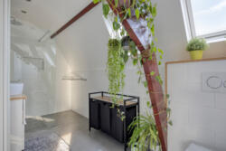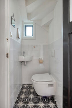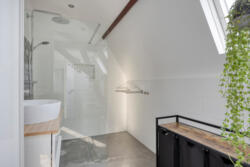 De badkamer is modern en tijdloos afgewerkt met een regendouche en losse handdouche, een tweede toilet, Beton Cire vloerafwerking, elektrische vloerverwarming, badkamermeubel en handdoekkast. Twee Velux dakramen zorgen voor daglicht en ventilatie.