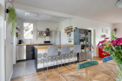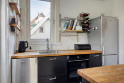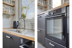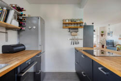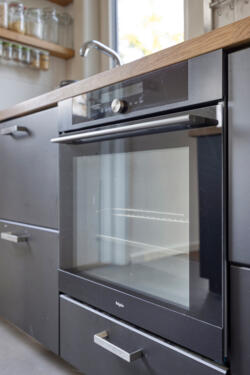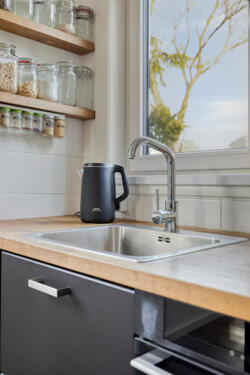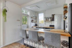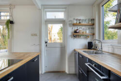 De open keuken is praktisch en modern ingericht en voorzien van een grote inductieplaat met geïntegreerde afzuiging, ruimte voor een royale koelkast en een inbouwoven (aanwezig, momenteel defect). De kozijnen aan deze zijde zijn in 2025 vernieuwd en uitgevoerd met triple glas.