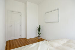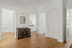 The apartment features two full-sized bedrooms and an additional room that can be used as a home office, walk-in closet or hobby room. The spacious and bright hallway connects all rooms in a pleasant way. Original built-in wardrobes provide ample storage space and are neatly finished, contributing to a clean and organized look.