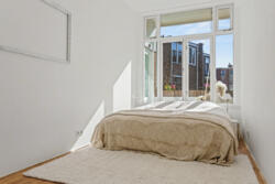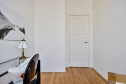 De woning beschikt over twee volwaardige slaapkamers en een extra kamer die perfect kan dienen als werkruimte, inloopkast of hobbykamer. De ruime, lichte gang verbindt de ruimtes op een prettige manier. Originele ingebouwde kasten bieden veel bergruimte en zijn netjes afgewerkt, wat zorgt voor een strak en opgeruimd geheel.
