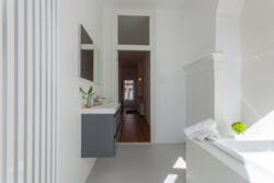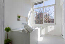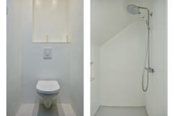 Uniek zijn de twee luxe badkamers: één met een royaal ligbad en één met een moderne inloopdouche met regendouche. Beide badkamers zijn hoogwaardig afgewerkt met onderhoudsvriendelijke materialen zoals epoxy wanden en gietvloeren. Daarnaast is er een separaat toilet en een slim weggewerkte wasruimte.