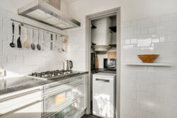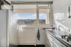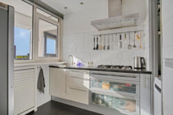 De keuken ligt aan de galerijzijde en is voorzien van een gaskookplaat, afzuigkap en voldoende kastruimte. In de aangrenzende kast is de boiler geplaatst.