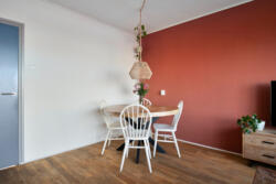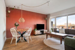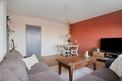 De woonkamer is ruim en licht, met grote raampartijen en een prettige indeling. De parketvloer zorgt voor een warme uitstraling. Vanuit de woonkamer heb je toegang tot het eerste balkon met vrij uitzicht over de wijk.