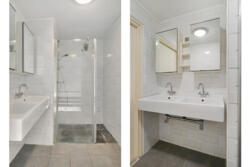 De badkamer is volledig betegeld en voorzien van een inloopdouche en dubbele wastafel. De gehele verdieping is afgewerkt met een nette laminaatvloer.