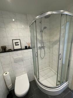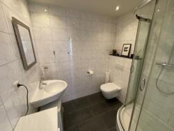 Geheel betegelde moderne badkamer (2,15x 1,80 m) uitgerust met douche, toilet en wastafel.
