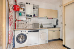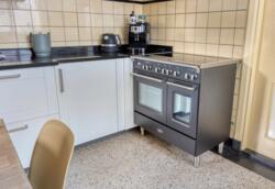 De moderne keuken met diverse inbouwapparatuur bevindt zich aan de achterzijde van de woning en biedt toegang tot een praktische, kleine koele kelderruimte. Aansluitend aan de keuken vindt u de bijkeuken met keukenblok, cv-opstelling, het toilet en toegang tot de tuin.