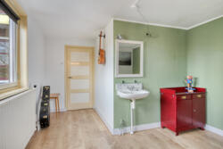 Via de entree komt u in de ruime hal met toegang tot de verschillende vertrekken. De royale woonkamer is voorzien van een prachtige houten vloer, een karakteristieke erker, houtkachel en serre met schuifpui naar de diepe, zonnige achtertuin.