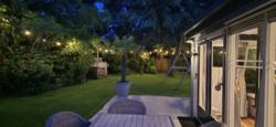 De tuin is voorzien van een vaste sproei-installatie en sfeervolle tuinverlichting via een lichtslinger die werkt op een schemerschakelaar.