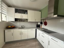 De open keuken, in hoekopstelling, is ruim opgezet en voorzien van een composieten werkblad, RVS afzuigkap, keramische kookplaat, nieuwe koelkast (okt '25) en vaatwasmachine (zomer '25).