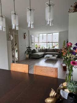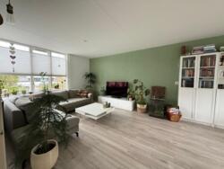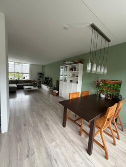 De woonkamer is ruim, sfeervol en voorzien van een nette laminaatvloer met brede vloerdelen.