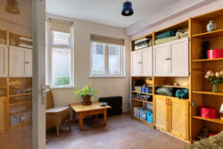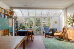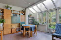 De woonkamer is aan de achterkant, uitkijkend op de tuin en gemeenschappelijke tuin met veel groen en mooie hoge bomen. Aan de achterkant is een grote serre, wat de woonkamer licht en ruim maakt. Via de achterdeur stap je zo in de kleine gezellige achtertuin.