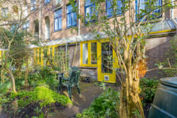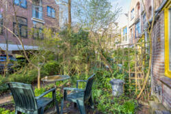 De tuin ligt op het zuiden. Je kunt daar heerlijk buiten zitten, in een parkachtige sfeer, wat niemand verwacht als je aan de voorkant door de straat loopt. Er loopt een smal wandelpaadje, wat een beetje een jungle-idee geeft. Soms komt de stadsrondleiding hier langs en dan hoor je iederen zoiets zeggen als " Wat is het hier mooi".